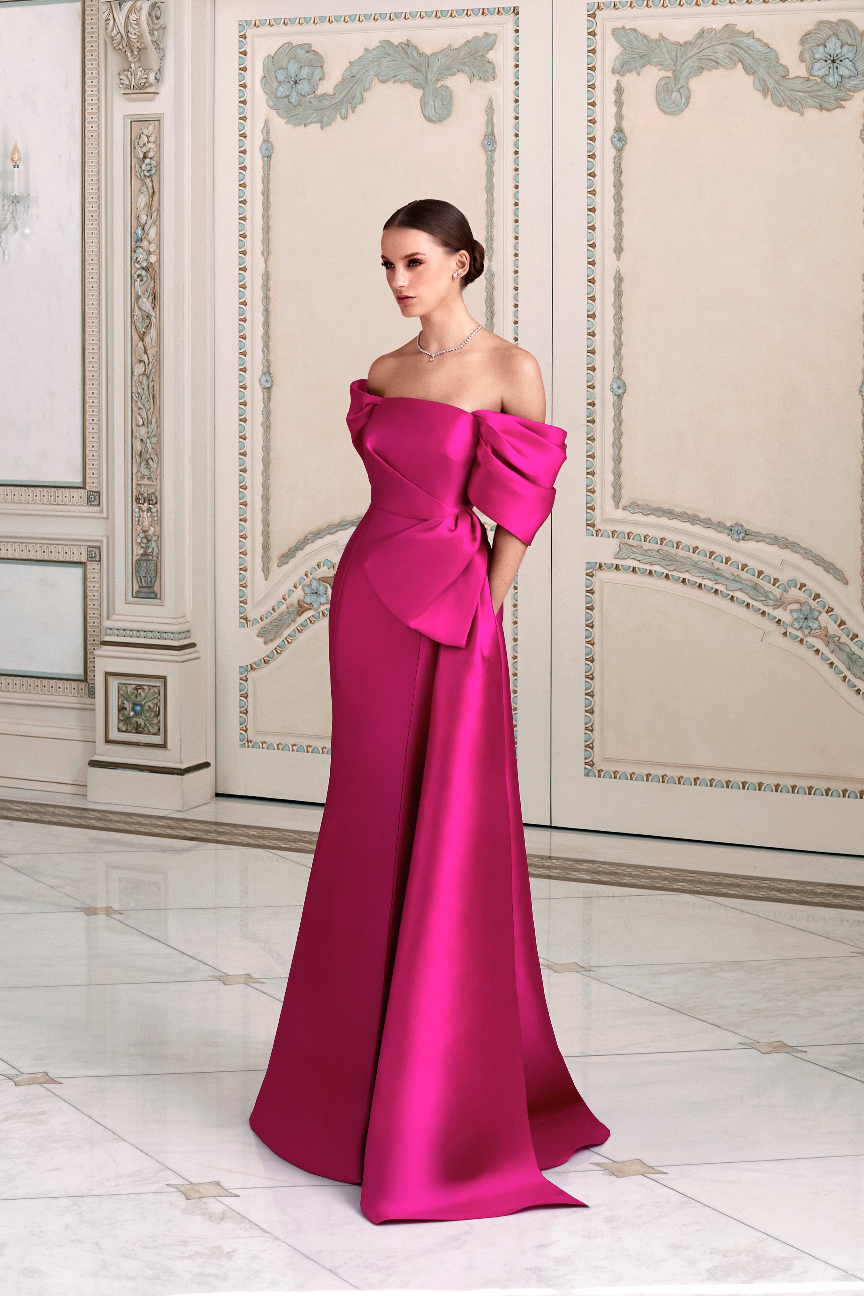 Radiating confidence and elegance, this off-shoulder satin gown features sculpted draping and an oversized statement bow detail that defines the waist. The rich fuchsia tone enhances the luminous finish of the fabric, while the elongated silhouette creates statuesque refinement. Designed for moments that call for presence.