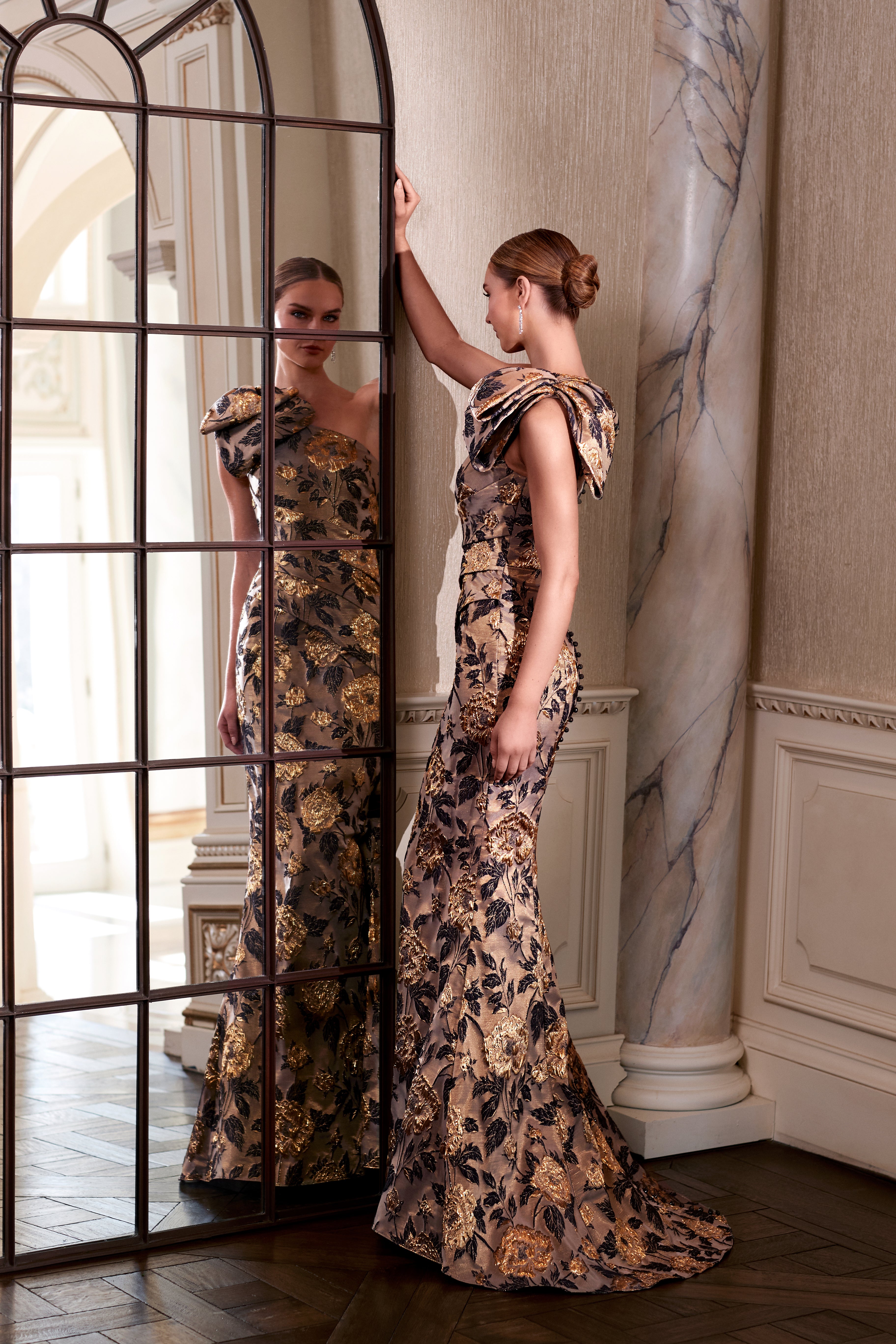 A statement in modern opulence, this sculpted one-shoulder silhouette is adorned with dimensional metallic florals over a luminous taupe base. The structured neckline drapes into an architectural shoulder detail, while the contoured fit elongates the figure before flowing into a refined train. Designed for grand entrances and unforgettable evenings.